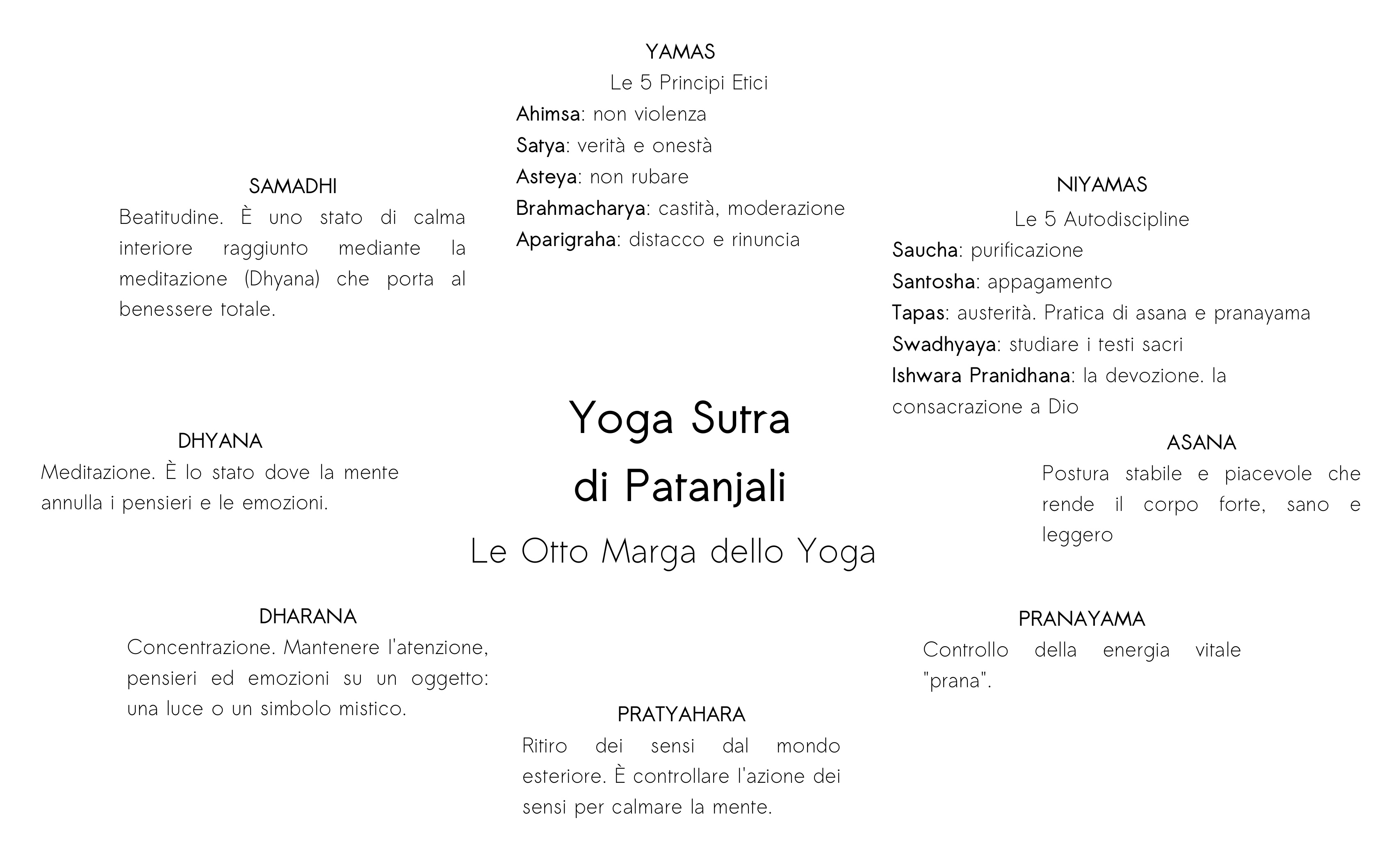 – Lo Raja Yoga, la via della meditazione, è stato codificato da Patañjali Maharishi nella sua grande opera lo Yoga Sutra (Aforismi sullo Yoga), conosciuta anche come Ashtânga Marga (ashta=otto; anga=arto), visto che la pratica si rivela progressivamente in otto parti. Essi sono: